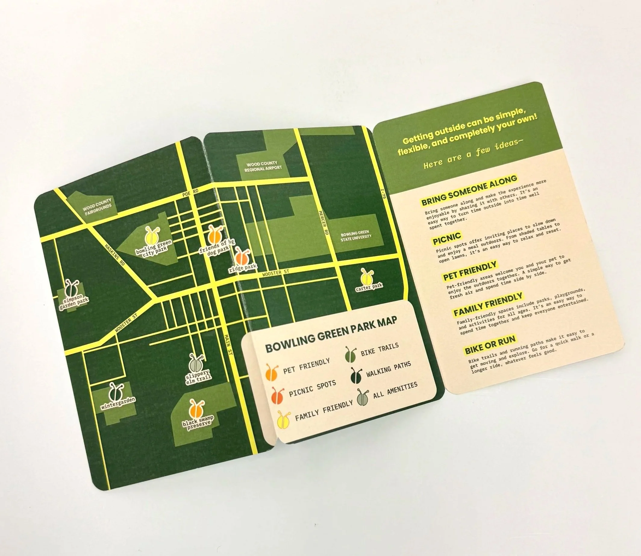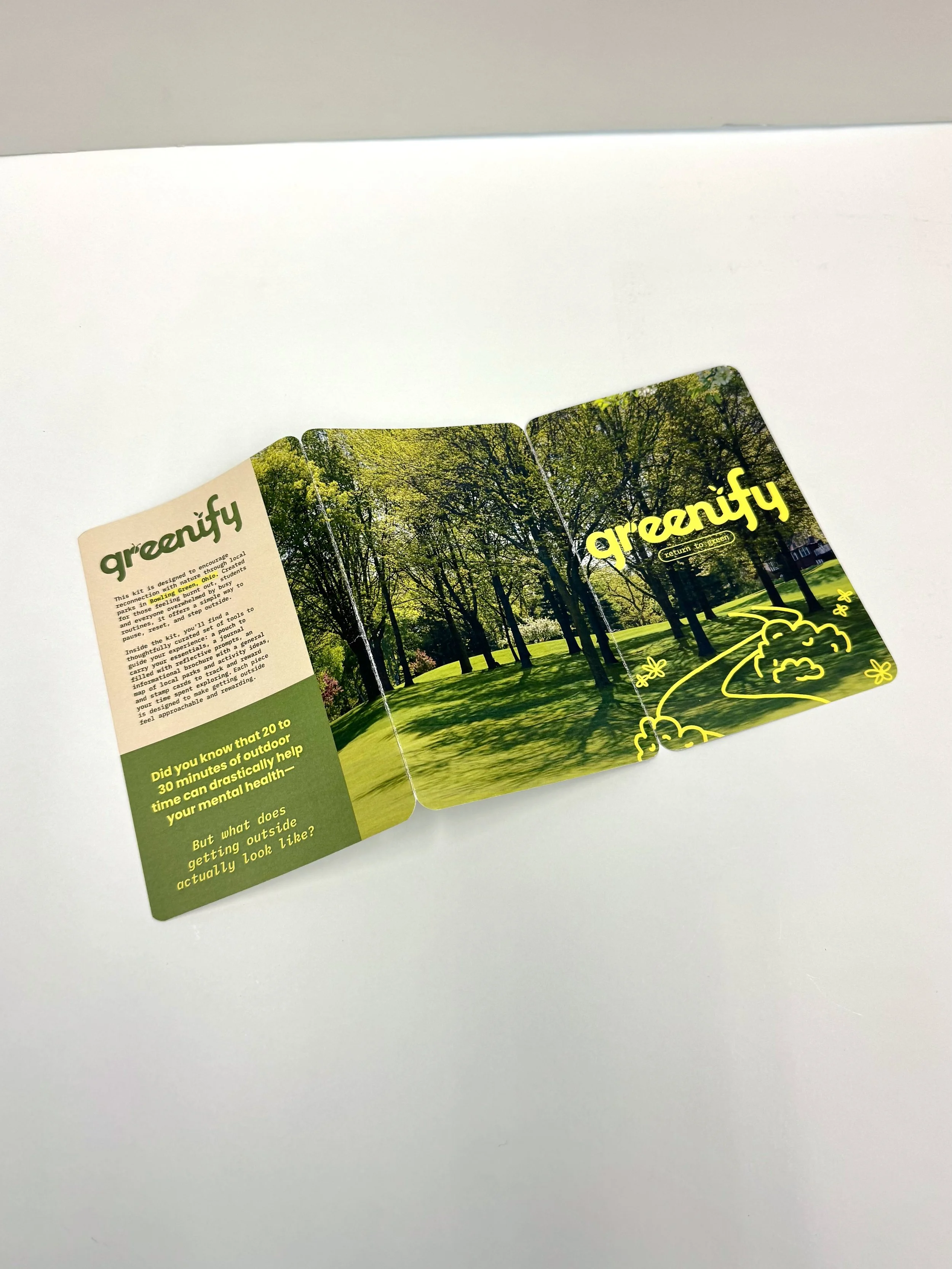 Greenify reframes nature as an accessible, everyday tool for reducing burnout by encouraging awareness and active engagement with local green spaces. The project includes an informational brochure with a general map and simple ideas for what to do at a park, making it easy for users to get outside without overthinking. A prompt card and guided journal support reflection, helping users slow down and reconnect with their surroundings in a meaningful, low-pressure way.