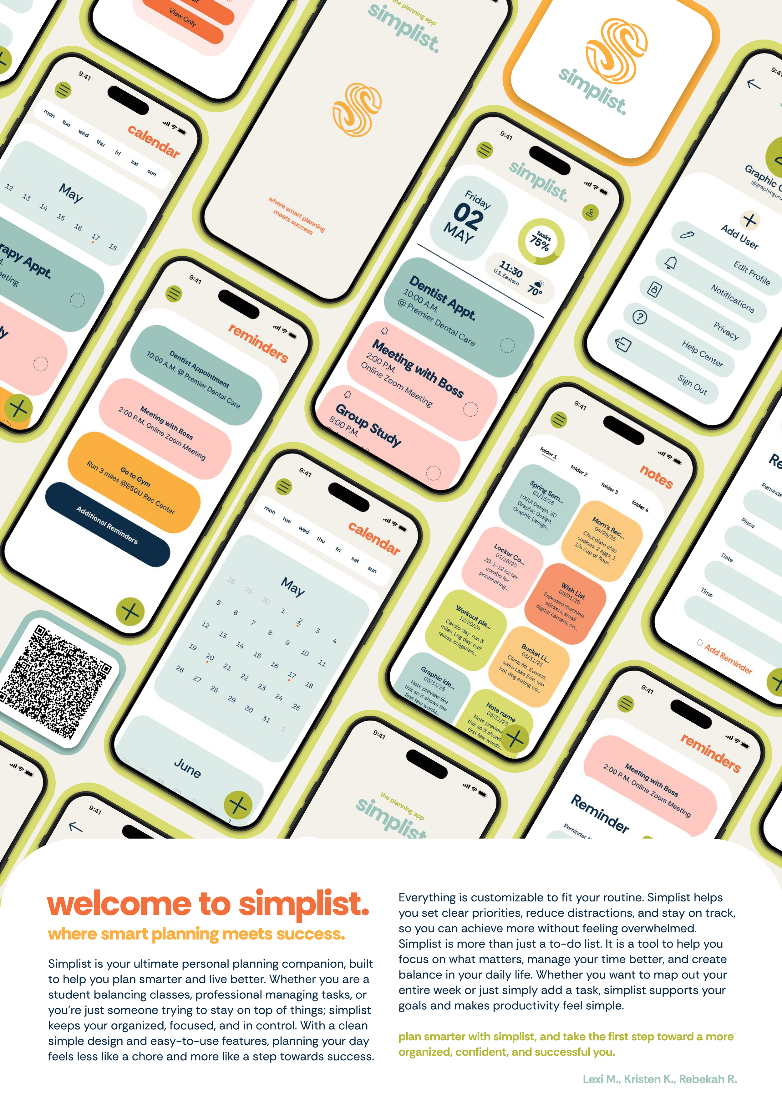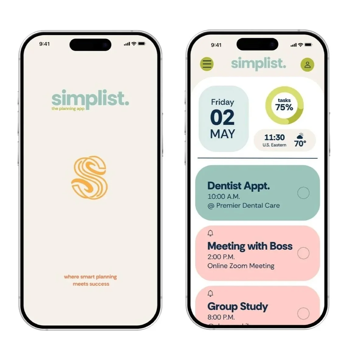 Simplist is a personal planning app prototype developed as a group project. My primary role focused on app navigation and visual identity, creating a clean, user-friendly system that supports organization, goal setting, and productivity. The design prioritizes clarity and simplicity to create a calm experience, helping users stay focused without feeling overstimulated.